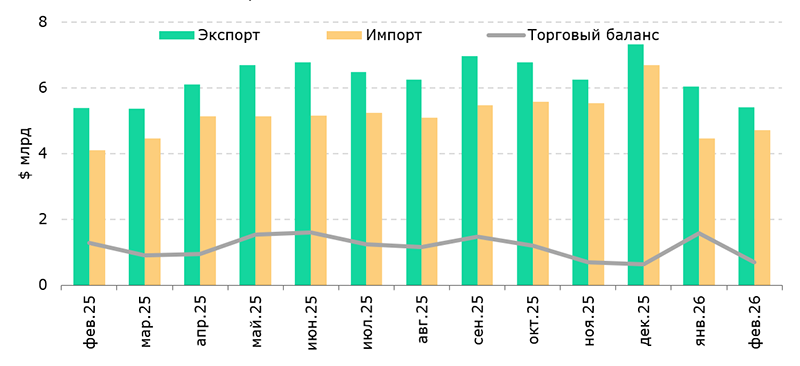 По данным Бюро национальной статистики РК, в феврале 2026 года экспорт товаров снизился на 10,5% м/м до $5,7 млрд, но в годовом выражении остался без изменений. Импорт увеличился на 5,9% м/м до $5 млрд и на 15,2% относительно февраля прошлого года. Показатели экспорта снизились на фоне ограничений в транспортировке, что имело место и в начале прошлого года, тогда как импорт технически существенно вырос из-за более низких значений в феврале 2025 года. Как следствие сокращения экспорта в сравнении с импортом, профицит торгового баланса снизился до минимальных значений ноября и декабря 2025 года – в $0,7 млрд против $1,7 млрд в январе.