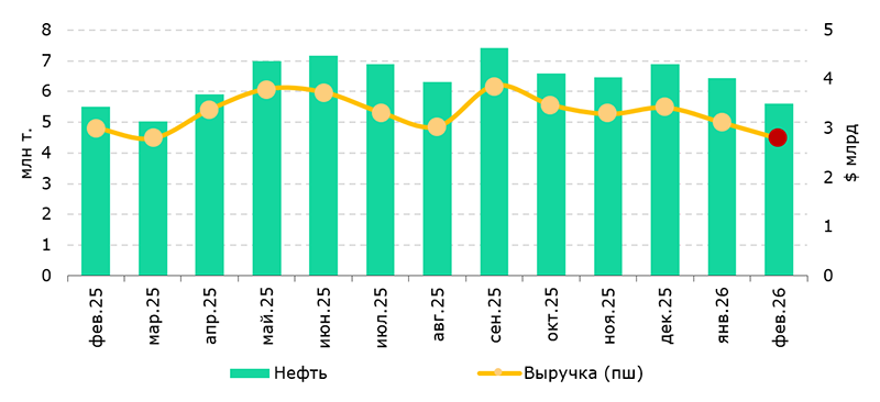 Значительная доля нефти в экспортной корзине Казахстана сказалась на февральских поставках. Выручка от нефти в феврале снизилась до $2,8 млрд (-10,5% м/м) и соответствовала минимальному значению с марта прошлого года. Как известно, добыча нефти в январе текущего года уменьшилась более чем на 30% относительно декабря 2025 года. В феврале, хотя рост нефтедобычи в значительной степени восстановился, он не в полной мере отразился на фактических поставках на внешние рынки. Учитывая существующий лаг между статистикой по экспорту нефти и фактическими расчетами за нее, это также повлияло на февральские данные. По этой же причине возросшие цены на нефть пока также не способствовали улучшению данных по внешней торговле. Так, несмотря на то что в феврале стоимость нефти марки Brent преодолела отметку в $70 за баррель, очевидно, что расчеты за углеводороды пока осуществлялись исходя из прежних котировок.