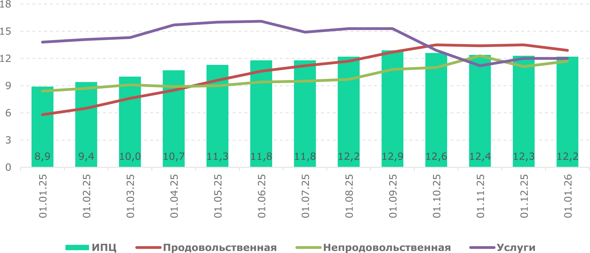 | ИПЦ | Продовольственные товары | Непродовольственные товары | Платные услуги | |