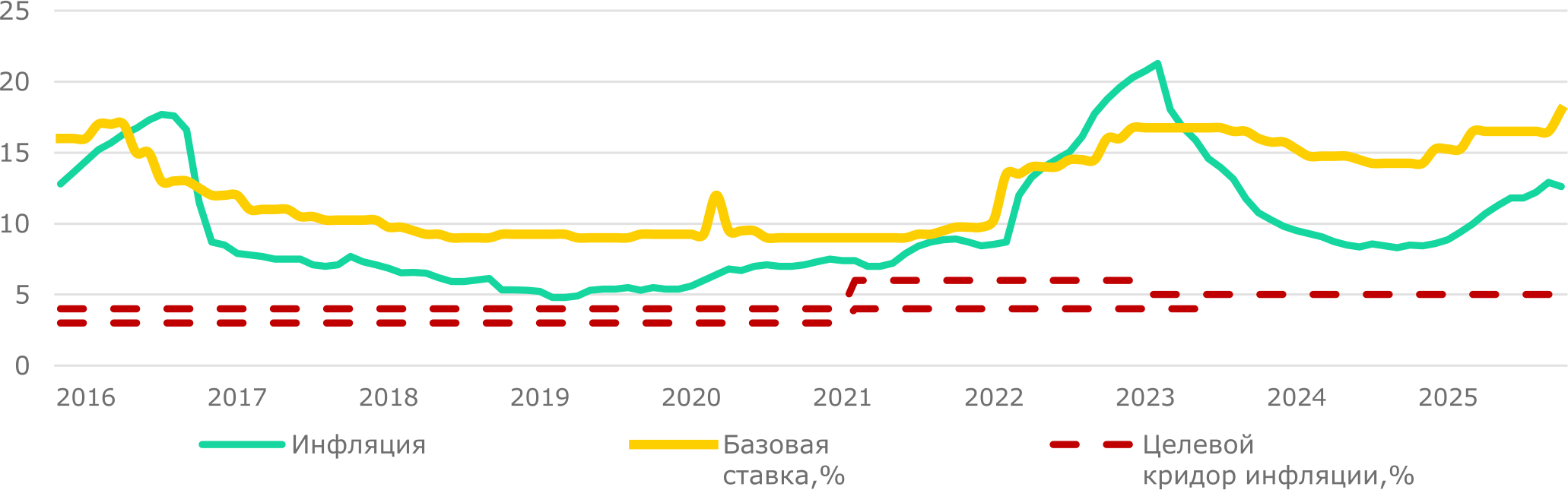 В отношении коммуникаций НБК можно отметить некоторую непоследовательность в его пояснениях. Например, в 2025 году НБК было принято два решения по значительному и резкому повышению базовой ставки. Первое решение в марте - с 15,25% до 16,50% с целью избежать необходимости более высокого повышения базовой ставки в будущем (согласно пресс-релизу НБК). Однако 10 октября этого же года НБК было принято второе решение по существенному повышению базовой ставки - с 16,50% сразу до 18,00%. При этом не были представлены пояснения касательно значительного ужесточения ДКП полугодом ранее, которое не смогло купировать основные причины высокой инфляции, хотя сами эти причины, по-видимому, оставались актуальными.