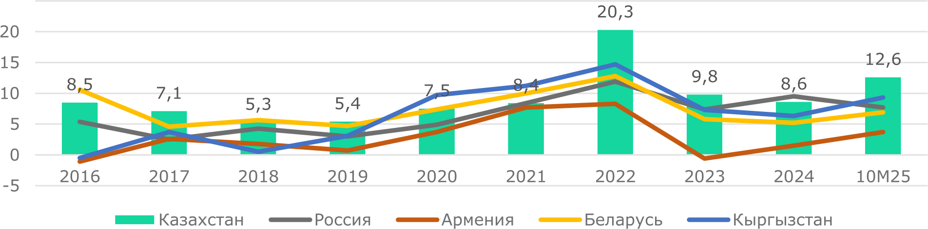 Рис. 2. Динамика инфляции в странах ЕАЭС, %