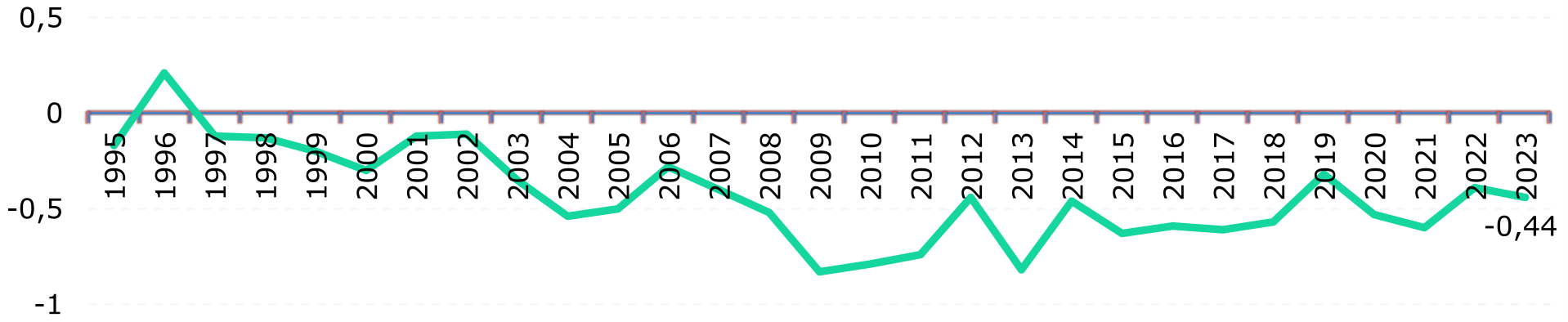 Данная тенденция подтверждается Индексом экономической сложности, отражающим степень диверсификации и технологичности экспорта страны, который показал ухудшение динамики: по данным лаборатории роста Гарвардского университета на 2023 год [11], Казахстан опустился в рейтинге на 89-е место с 84-го годом ранее (Рис. 4).