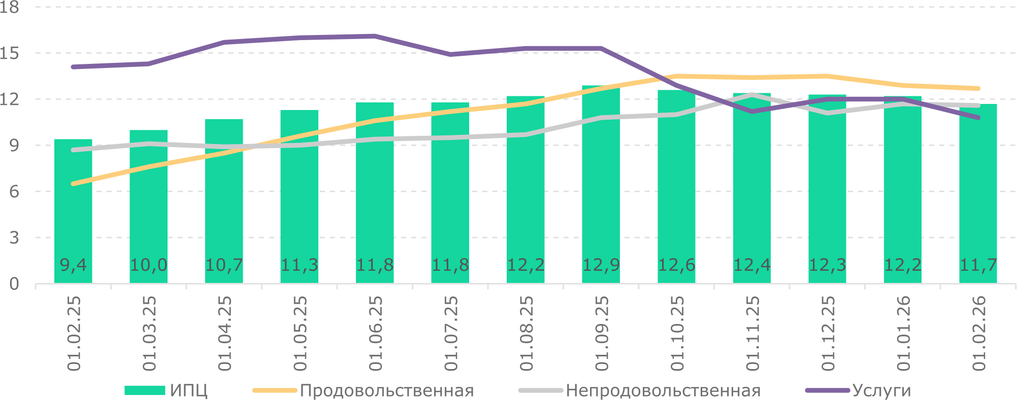 | Февраль 2026 | 1,1 | 1,3 | 0,9 | 1,0 |