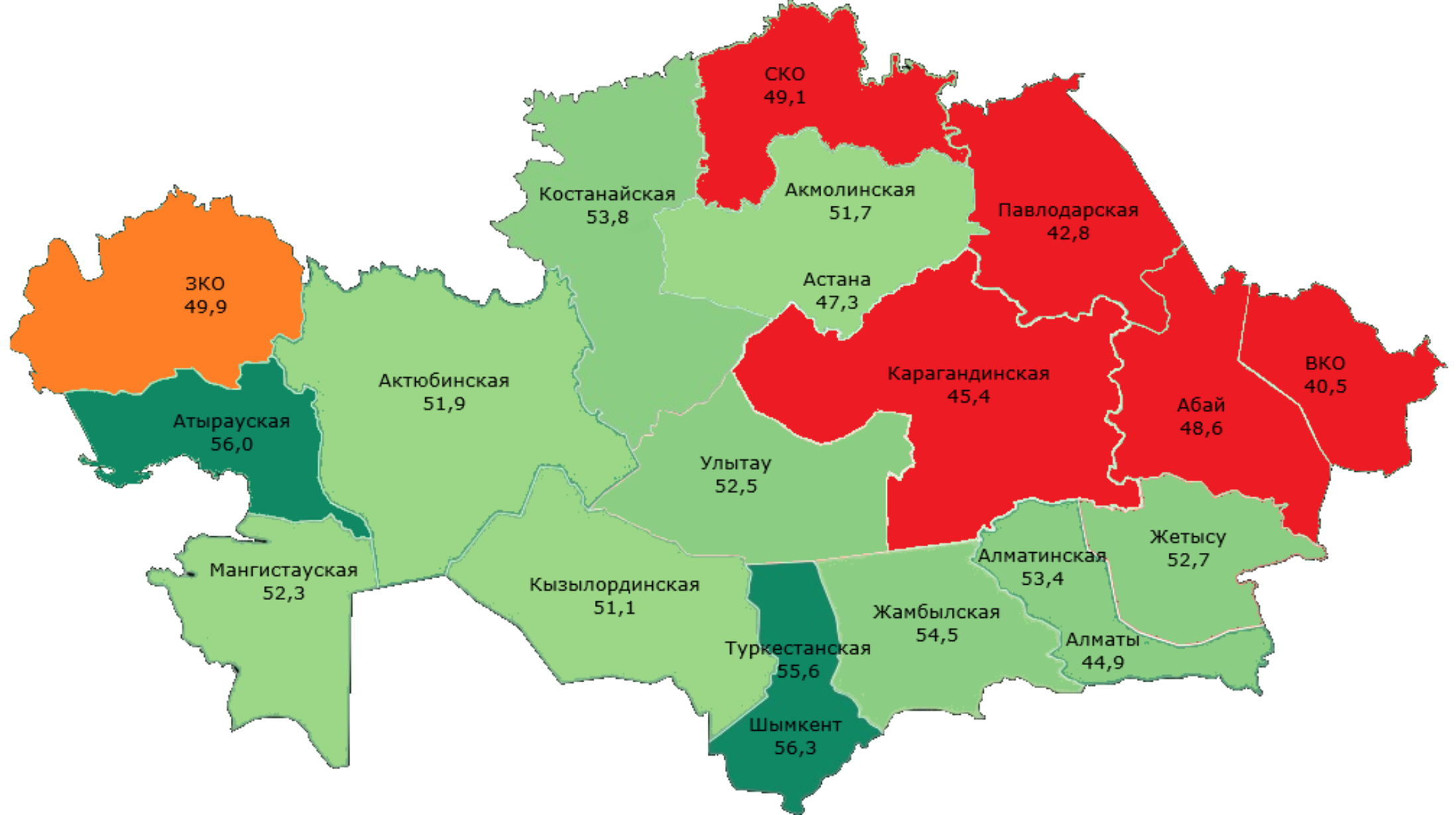 Наиболее высокие значения индекса были зафиксированы в Атырауской (56,0), Туркестанской (55,6) областях и городе Шымкент (56,3), тогда как наименьшие - в Восточно-Казахстанской (40,5) и Павлодарской (42,8) областях. Расширение деловой активности наблюдалось в сельском хозяйстве (52,6) и предоставлении услуг по проживанию и питанию (50,5), а также промышленности: горнодобывающей (50,6) и обрабатывающей (51,1). В зоне снижения находились строительство (49,5) и торговля (47,8).