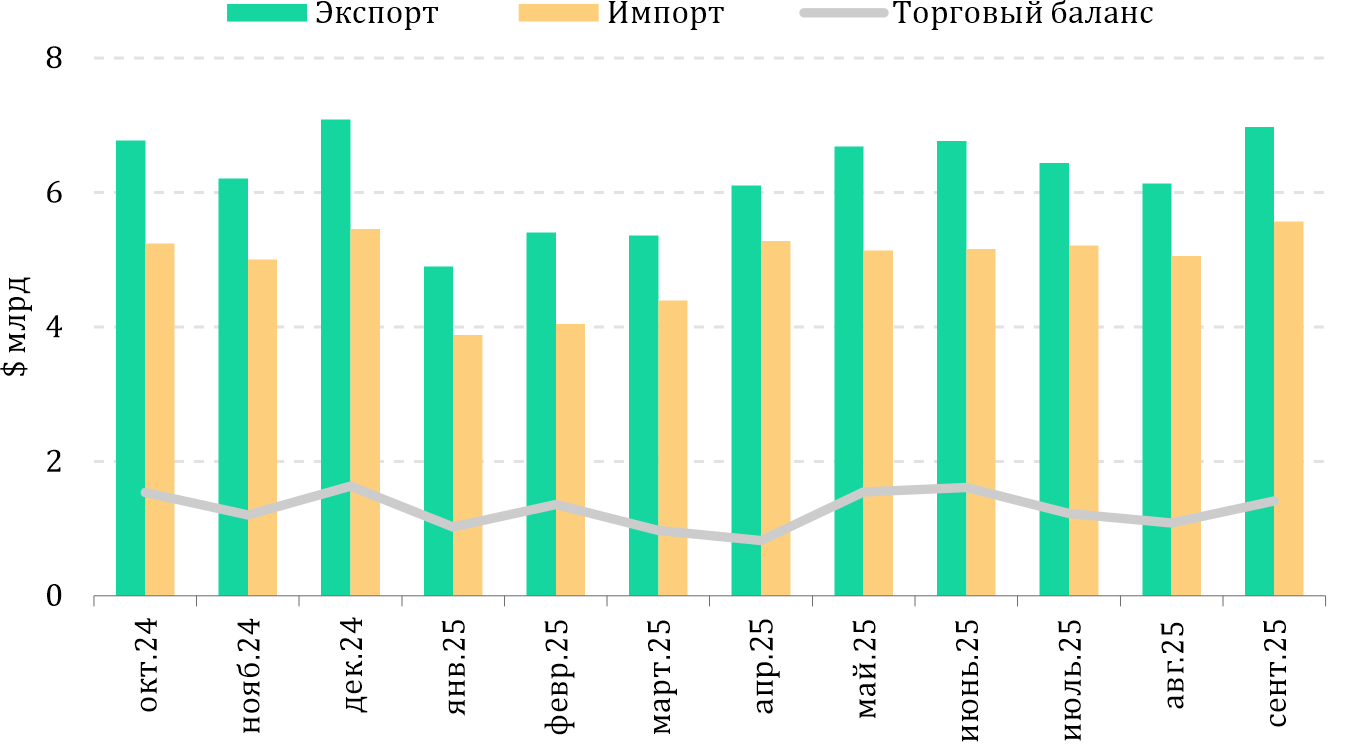 Объемы импорта в сентябре также заметно увеличились на 10,1% м/м (+18,3% г/г) до $5,8 млрд и достигли рекордного за все время показателя. Предыдущий рекорд в $5,7 млрд был зафиксирован в декабре прошлого года. За 9М2025 г. общие объемы импорта повысились на 4,5% г/г до $45,9 млрд ($43,9 млрд за 9М2024 г.). Тем самым показатели импорта уверенно движутся к новому рекорду после того, как они уже были максимальными в прошлом году, превысив планку в $60 млрд.