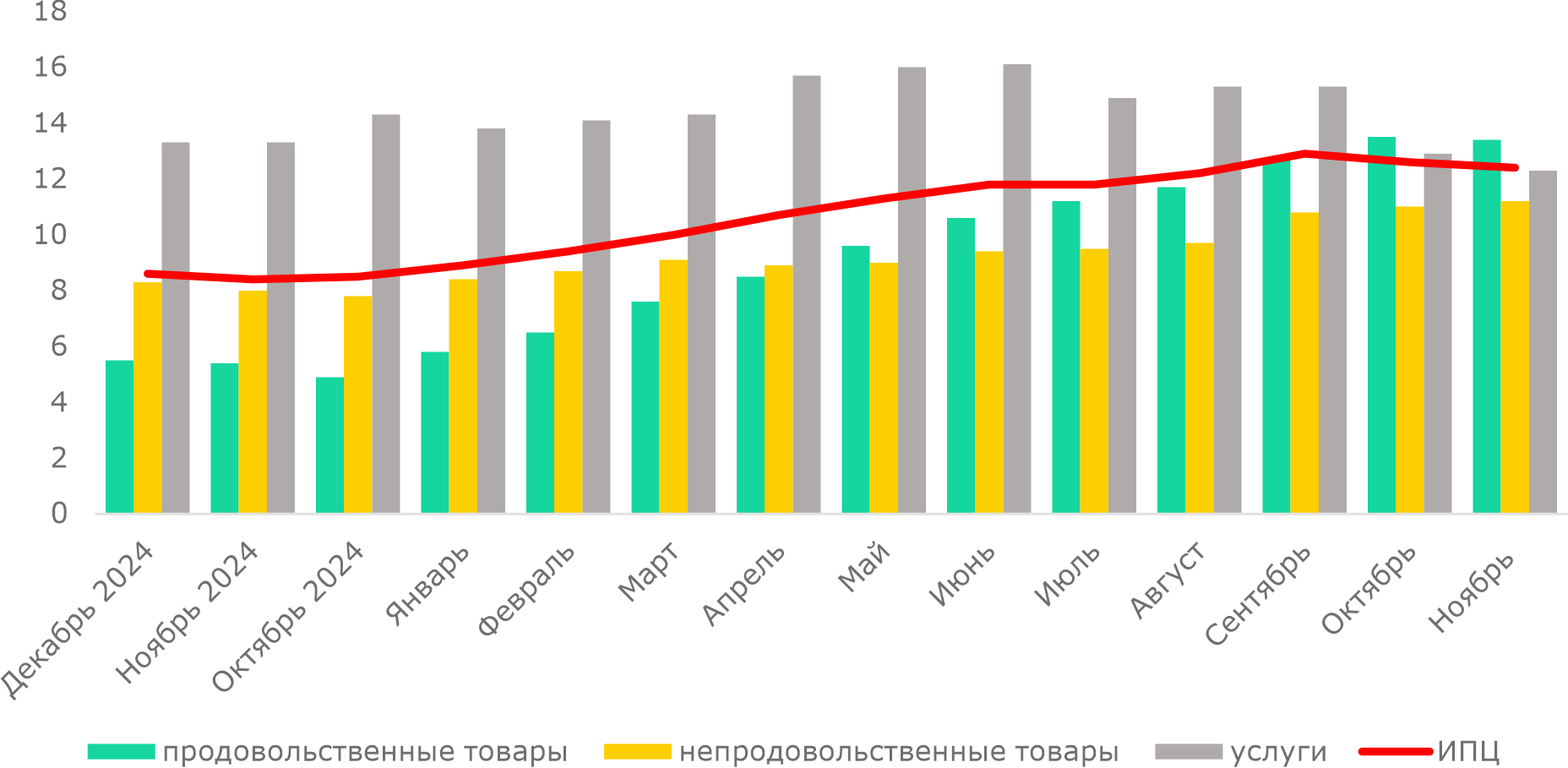 Месячная инфляция в ноябре была обусловлена ростом цен на услуги после снижения в октябре, замедлением роста цен на непродовольственные товары, что связано с укреплением тенге к доллару, и сохранением высокой месячной инфляции на продовольственные товары, что связано с укреплением рубля в России в ноябре, то есть сохраняется слабость тенге относительно рубля.