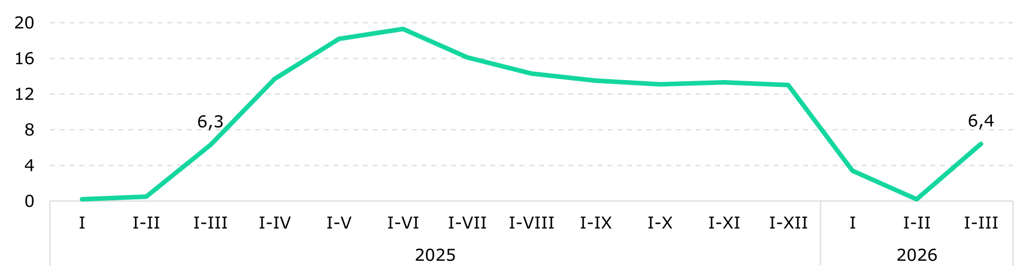 Снижение инвестиций в январе-марте 2026 года по сравнению с аналогичным периодом прошлого года наблюдалось в горнодобывающей промышленности (-9,8% г/г), строительстве (-2,1% г/г), финансах (-39,3% г/г), а также в финансируемых из бюджета секторах: водоснабжении (-12,4% г/г), образовании (-72,5% г/г) и здравоохранении (-4,4% г/г).
