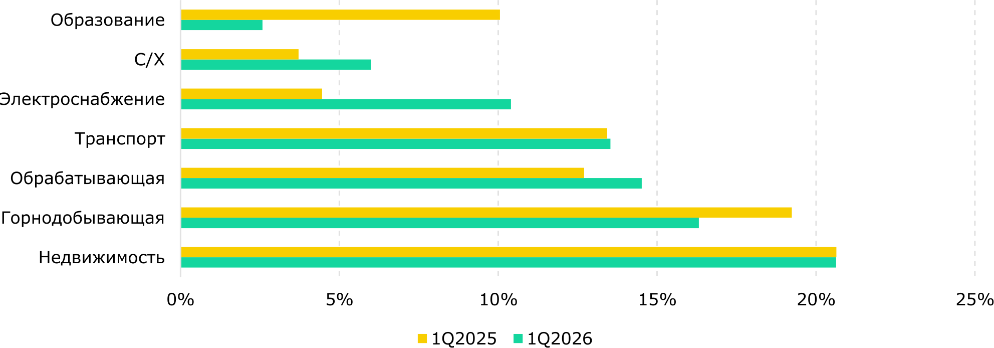 В отраслевой структуре инвестиций сектор операций с недвижимостью продолжает удерживать лидирующие позиции с долей в 20,6%. За счет наращивания инвестиций в отрасли электроснабжения ее доля в объеме ИОК выросла с 4,5% в 1Q2025 до 10,4% в 1Q2026 (Рис. 2). Благодаря значительному росту инвестиций в обрабатывающую промышленность и сокращению в горнодобывающую, первый сектор постепенно сокращает разрыв в общей доле инвестиций с горнодобывающей промышленностью – 14,5% против 16,3% соответственно. Для обеспечения долгосрочной устойчивости и качественного изменения структуры экономики приоритетной задачей остается сохранение опережающего роста капиталовложений в обрабатывающую промышленность относительно добывающей. Отметим положительный факт того, что рост инвестиций в обрабатывающую промышленность обеспечивается за счет увеличения вложений в производство продуктов питания (+263,4% г/г), химической продукции (+49,4% г/г), фармацевтических продуктов (+85,6% г/г) и электрического оборудования (+206,3% г/г), которые в совокупности занимают 45% всех инвестиций в обрабатывающую промышленность.