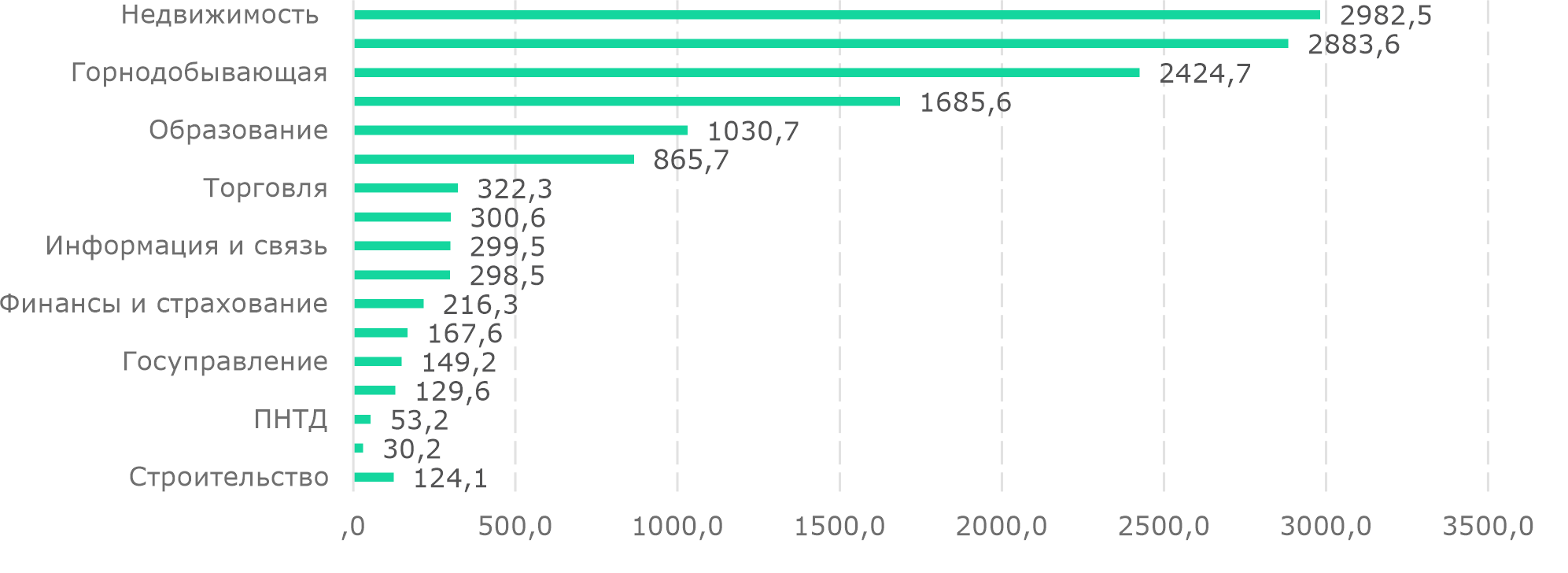 Лидером среди отраслей по номинальным объемам ИОК остается недвижимость с показателем Т2,98 трлн (+8,4% г/г). За ней следуют транспорт и складирование (Т2,88 трлн; + 14,8% г/г) и горнодобывающая промышленность (Т2,42 трлн; -16,8% г/г) (Рис. 2). При этом необходимо отметить, что в транспорте треть всего объема ИОК составляют бюджетные средства.