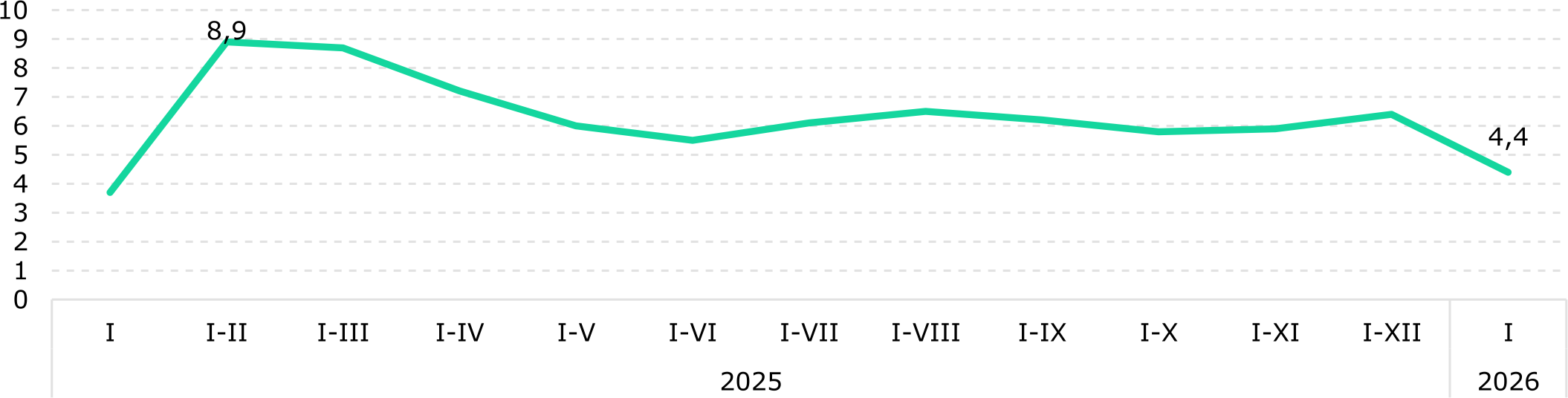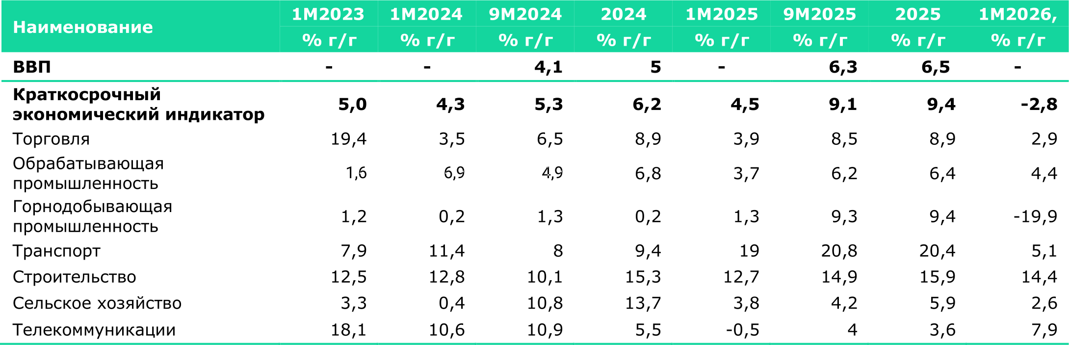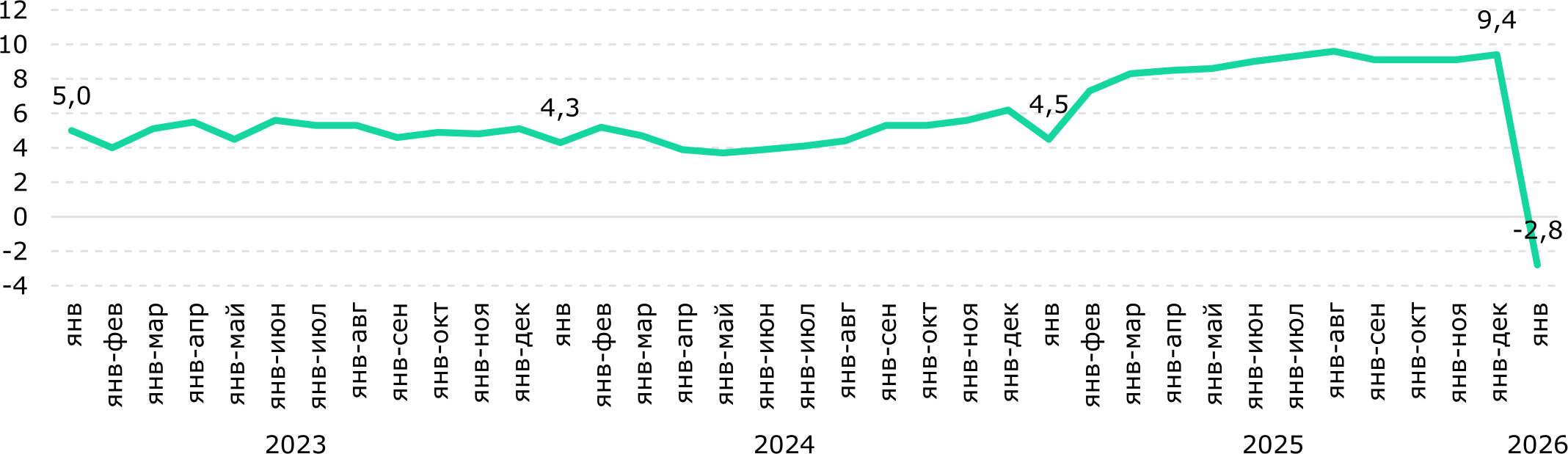По данным Бюро национальной статистики, краткосрочный экономический индикатор (КЭИ), который составляет свыше 60% от ВВП, в январе 2026 года снизился на 2,8% г/г. Данный показатель демонстрирует существенное снижение по отношению к январским показателям 2025 года (4,5% г/г) и 2024 года (9,4%), достигнув минимального значения за последние четыре года (Рис. 1).