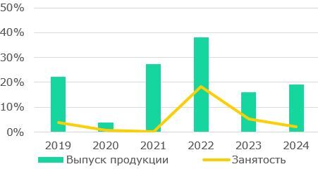 Динамика МСП.  В 2024 году объем выпуска продукции вырос на 19% г/г и составил по итогам года Т81,9 трлн. На протяжении последних 6 лет МСП демонстрируют двузначные темпы роста выпуска, за исключением замедления темпа роста в 2020 году вследствие спада экономической активности в период пандемии (Рис.1). Господдержка бизнеса (налоговые послабления, снижение регуляторной нагрузки, упрощенная регистрация ИП), а также доступные кредитные ресурсы помогли МСП преодолеть кризисный 2020 год и возобновить рост. Кроме того, рост выпуска продукции в 2021–2022 годах поддержали миграция компаний из России, пик которой пришёлся на 2022 год, а также введение моратория на проверки МСП на период с 01.01.2020 года по 01.01.2024 года, который снизил административную нагрузку на бизнес. В 2023 году темпы роста выпуска замедлились, что связано с высокой базой предыдущих лет и, частично, сокращением потока миграции бизнеса из России.