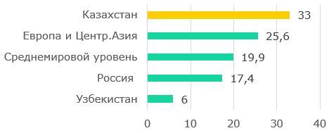 Для занятости в МСП в целом характерна низкая квалификация рабочей силы. Так, по данным Всемирного Банка , в Казахстане доля предприятий с низкой квалификацией занятых составляет 33%, что значительно выше, чем в странах Европы и Центральной Азии (25,6%). В среднем по миру она составляет 19,9%, в России – 17,4%, а в Узбекистане – всего 6% (Рис.10). Учитывая, что большую часть предприятий в Казахстане составляют МСП, то данная тенденция характерна в основном для малых предприятий.