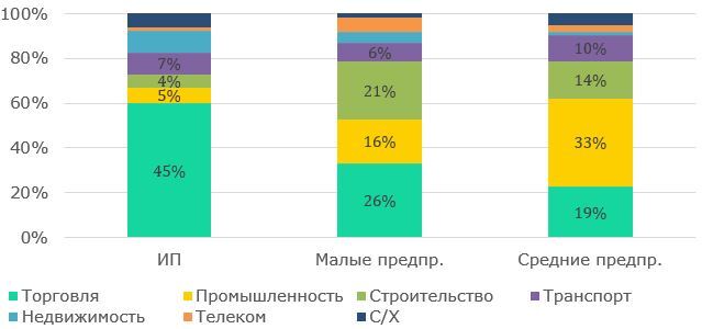 Отраслевая структура. В отраслевой структуре традиционно сохраняется тенденция преобладающей доли МСП в торговле, как наиболее маржинальной отрасли с низким порогом входа, широкой географией и развитой цифровой инфраструктурой.