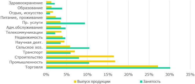 Отраслевая структура МСП в целом сохраняет свое распределение с 2019 года, с доминированием торговли по численности, выпуску и уровню занятости.