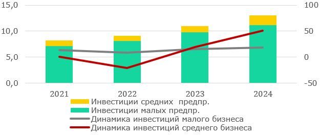 Средний бизнес после временного спада в 2022 году демонстрирует положительную динамику инвестиций. Тем не менее, доля среднего бизнеса минимальна в структуре всех инвестиций в экономике (10%), что определяется сложностями с привлечением финансирования, снижающими инвестиционную активность. Программы господдержки и льготы чаще ориентированы на малый бизнес, тогда как средний бизнес остается менее охваченным целевыми мерами. Эти факторы приводят к тому, что средний бизнес не может в полной мере реализовать свой потенциал в инвестиционной сфере.