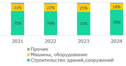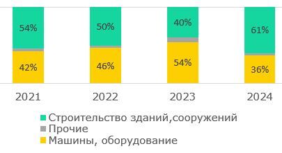 Для инвестиций малых предприятий характерен существенный акцент на инвестициях в строительство зданий и сооружений, на долю которых в 2024 году пришлось 79% всех капвложений малых предприятий, чему способствуют госпрограммы инфраструктурного и жилищного строительства, которые охватывают широкий спектр строительных и ремонтных работ (Рис.15).