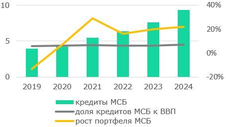 Заёмное финансирование для МСП — это наиболее доступный способ поддержания и развития бизнеса в условиях ограниченности собственных средств и активной господдержки. В этой связи большинство банков рассматривают данный сегмент как возможность расширения кредитования.  Несмотря на активную динамику кредитного портфеля МСП в последние годы, доля кредитов МСП к ВВП остаётся на уровне 6-7% с 2018 года (Рис.17), что ниже уровня в развитых странах (15–20%).