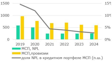 Кредитование МСП. По итогам 2024 года кредитный портфель МСП составил Т9,3 трлн (+20% г/г), что составляет 26% кредитного портфеля банковского сектора экономике. За период 2019-2024 годы в среднем рост кредитования МСП составил 14%, чему способствовали ряд факторов: рост экономики, внедрение цифровизации, развитие онлайн-продуктов, а также государственная поддержка МСП.