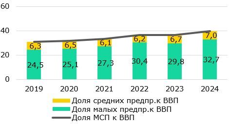 В то время как доля малых предприятий к ВВП с 2019 года выросла на 7,7 п.п, средние предприятия показывают более сдержанную динамику – рост составил всего 0,7 п.п., сложившись по итогам 2024 года на уровне 7,0% при целевом индикаторе в 15% в 2025 году.