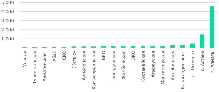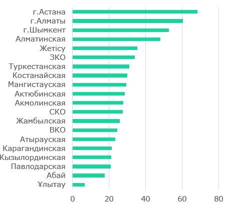 В региональном разрезе 65% кредитного портфеля МСП сконцентрировано в 2 крупнейших городах страны – Алматы, Астана, что способствует их динамичному развитию, но одновременно усиливает региональные диспропорции, ограничивая возможности для бизнеса и экономического роста в других регионах страны (Рис.20).