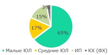 Таким образом, в структуре МСП большую часть представляют ИП (69,7%) и малые предприятия (17,5%), крестьянские хозяйства составляют 12,6%, юрлица среднего предпринимательства – 0,2% (Рис.8). Необходимо отметить весьма низкую представленность средних предприятий, количество которых на протяжении 6 последних лет практически не растет.