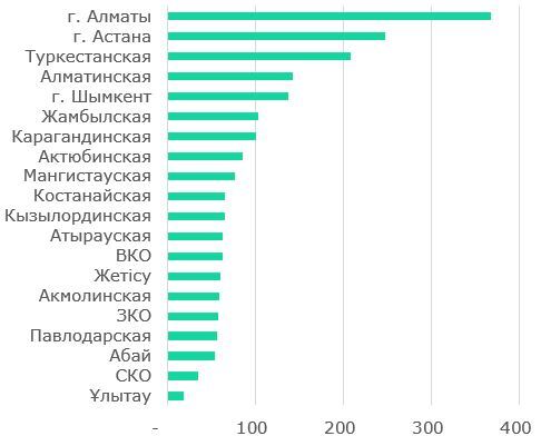 Региональная структура МСП. Крупнейшие города страны – Астана, Алматы и Шымкент — занимают лидирующие позиции в сегменте МСП.