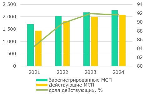 Численность МСП. Количество действующих МСП стабильно растет, но темпы роста новых МСП значительно снизились за последние 5-6 лет. На конец 2024 года их количество составило 2 072 тыс, увеличившись на 3,5% г/г против 10,1% г/г в 2023 году. Доля действующих МСП в 2024 году незначительно снизилась (Рис.7). Тем не менее, данный показатель значительно увеличился с 2019 года, когда он составлял 82,9%. Восстановление экономики после пандемии, релокация компаний из соседних стран, внедрение электронных сервисов для бизнеса способствовали росту жизнеспособности МСП. Надо отметить, что в статистике к действующим субъектам относят зарегистрированные и еще не осуществляющие экономическую деятельность, а также временно приостановившие деятельность предприятия. Таким образом, реальное число активно действующих компаний ниже.