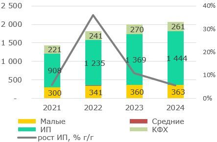 Кроме низкой представленности юрлиц среднего предпринимательства в сегменте МСП (0,2% от общего числа субъектов МСП), развитие сегмента среднего бизнеса осложняется рядом факторов, которые будут представлены ниже. Тем не менее, средние предприятия обеспечивают 17% выпуска продукции (по итогам 2024 года) в сегменте МСП против 15%, обеспечиваемой ИП, и 3%-ой доли крестьянских хозяйств, что говорит о более высокой производительности средних предприятий (Рис.4).
