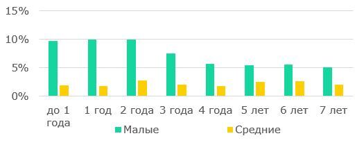 Рис. 9. Структура МСП по сроку существования, % к общему числу малых/средних компаний на 31.12.2024 года