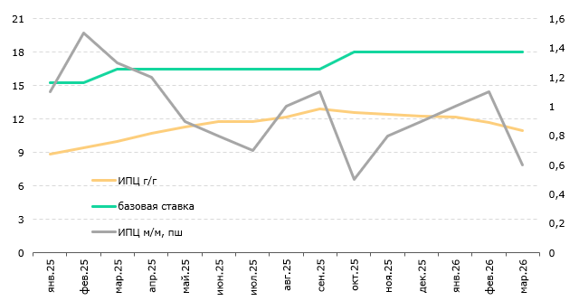 24 апреля Комитет по денежно-кредитной политике Национального Банка примет очередное решение по базовой ставке. По итогам марта текущего года годовая инфляция находилась в дезинфляционном тренде второй квартал подряд. В то же время в месячном выражении отмечалось заметное ускорение с 0,7% в среднем в 4 квартале 2025 года до 0,9% в первом квартале 2026 года. Тем самым, вопреки действию моратория на повышение тарифов и стоимости топлива наряду с укреплением курса тенге, рост цен носил более выраженный характер.