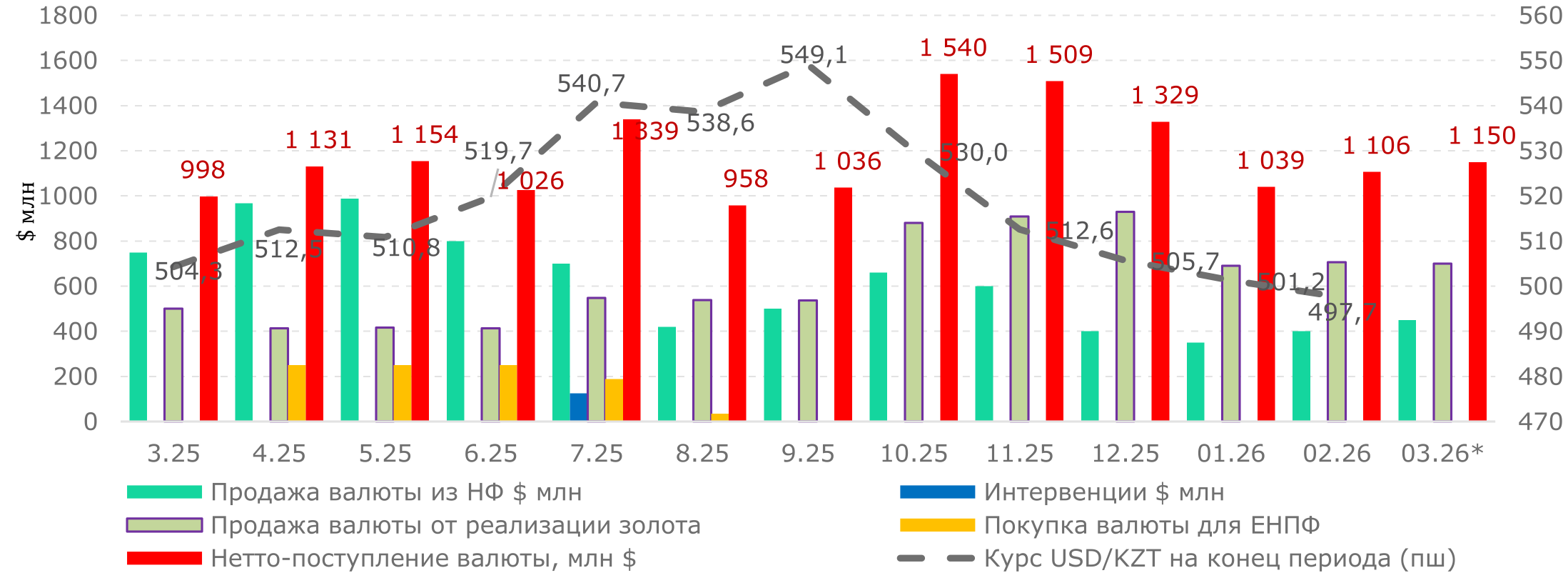 В рамках зеркалирования в марте 2026 года планируется продажа иностранной валюты в эквиваленте Т350 млрд, что ниже уровней 2025 года. Продолжится применение нормы об обязательной продаже 50% валютной выручки субъектами квазигосударственного сектора. Приобретение валюты для ЕНПФ в марте 2026 года не планируется. В итоге, чистые продажи валюты со стороны НБК в марте составят порядка $1 150 млн (в нетто-продажи Нацбанка входят сумма продажи валюты из НФ и сумма продажи валюты от реализации золота).