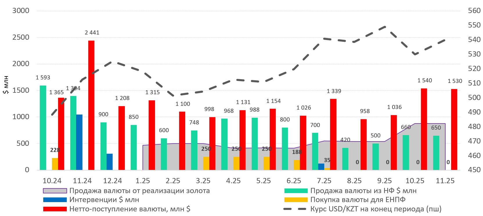 В итоге, чистые продажи валюты на рынке со стороны Нацбанка в ноябре составят порядка $1 480-1 580 млн (в нетто-продажи Нацбанка входят сумма продажи валюты из НФ и сумма продажи валюты от реализации золота), превышая показатели предыдущих месяцев 2025 года.