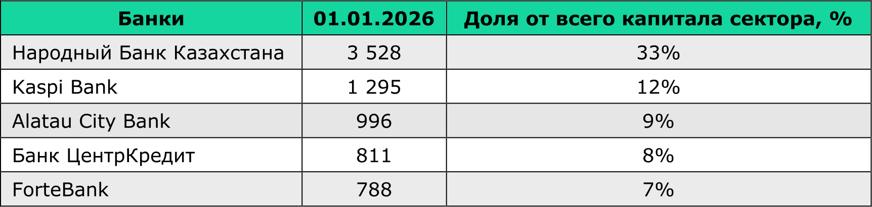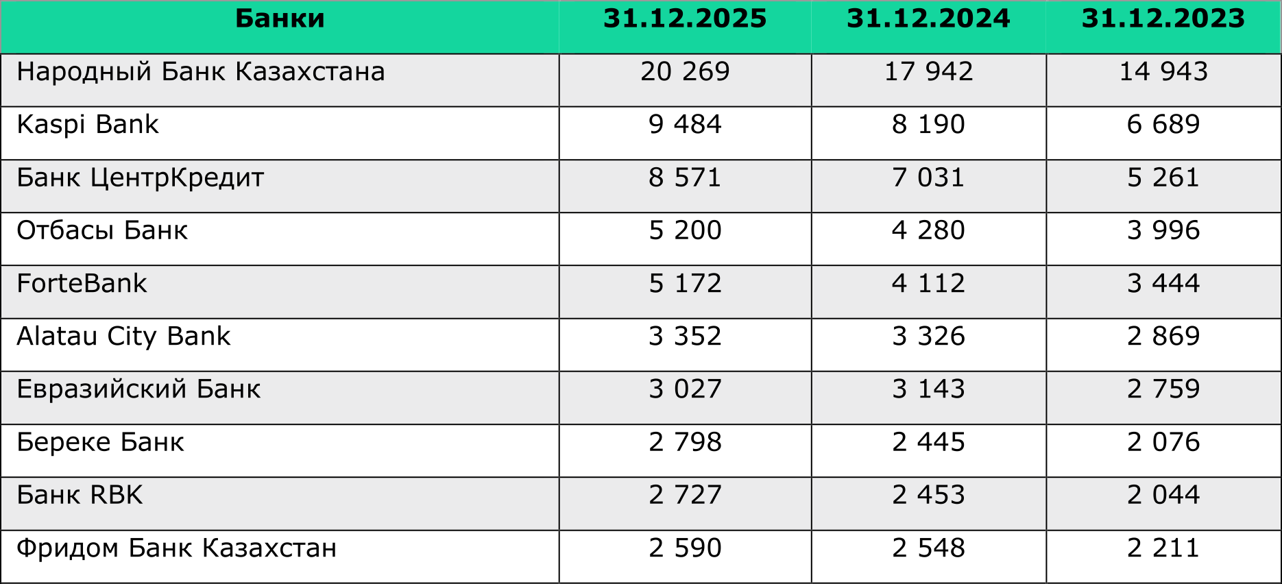 Динамика вкладов в 2025 году обеспечена ростом объемов депозитов многих крупных банков. Так, за 12 месяцев 2025 года среди банков первого эшелона, доля которых в совокупном депозитном портфеле банковского сектора на конец декабря 2025 года составила 96%, значительное увеличение депозитов наблюдалось у 10 банков из 13-ти, тогда как снижение было отмечено только у Alatau City Bank (-7,4% г/г), Евразийского банка (-5,3% г/г) и Ситибанка (-16,8% г/г).