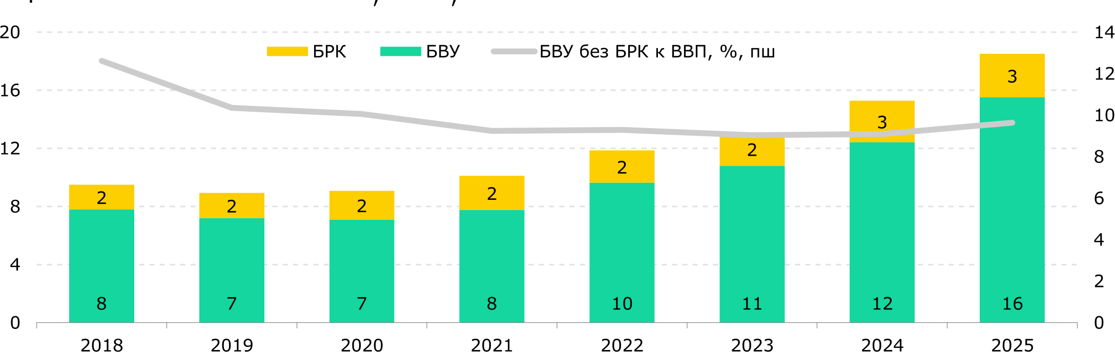 Доля корпоративных кредитов к ВВП в 2025 году составила 9,7% против 12,6% в 2018 году и 21,3% в 2013 году (Рис. 7). В целом динамика корпоративного кредитования характеризовалась двузначными темпами роста, при этом портфель кредитов БРК расширялся заметно медленнее, чем у коммерческих банков.