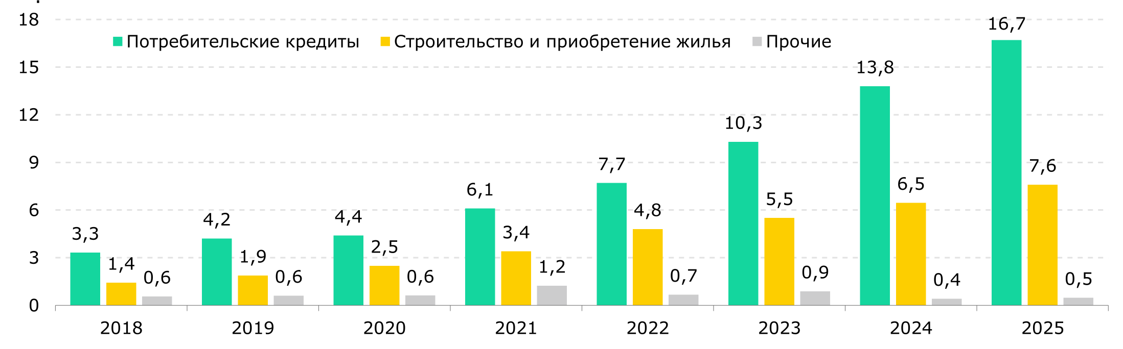 Сегмент потребительского кредитования характеризуется повышенным уровнем риска ввиду более низкого качества активов в сравнении с совокупным розничным портфелем. Дополнительным фактором уязвимости выступает опережающая динамика роста задолженности домохозяйств в последние годы относительно темпов увеличения реальных доходов населения.