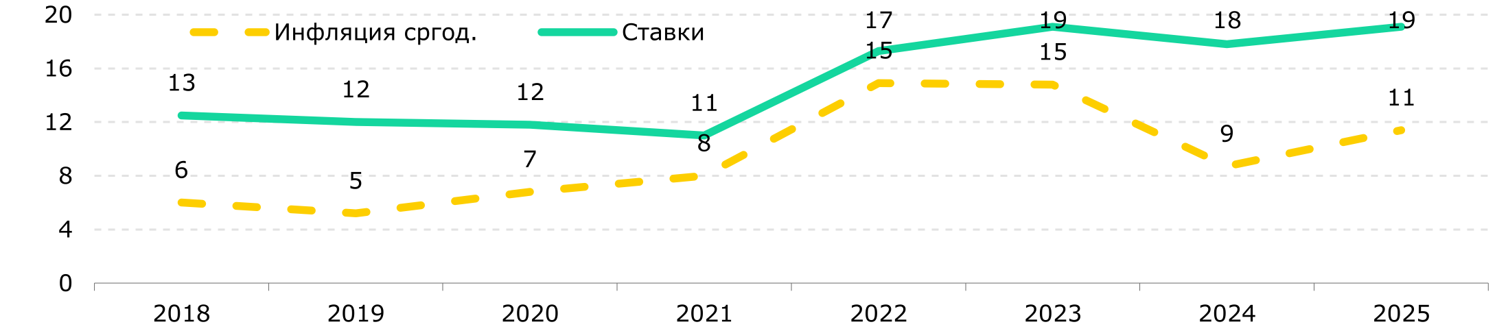 Рис. 8. Инфляция и средневзвешенные ставки вознаграждения по корпоративным кредитам, % сргод. (2018-2025 годы)