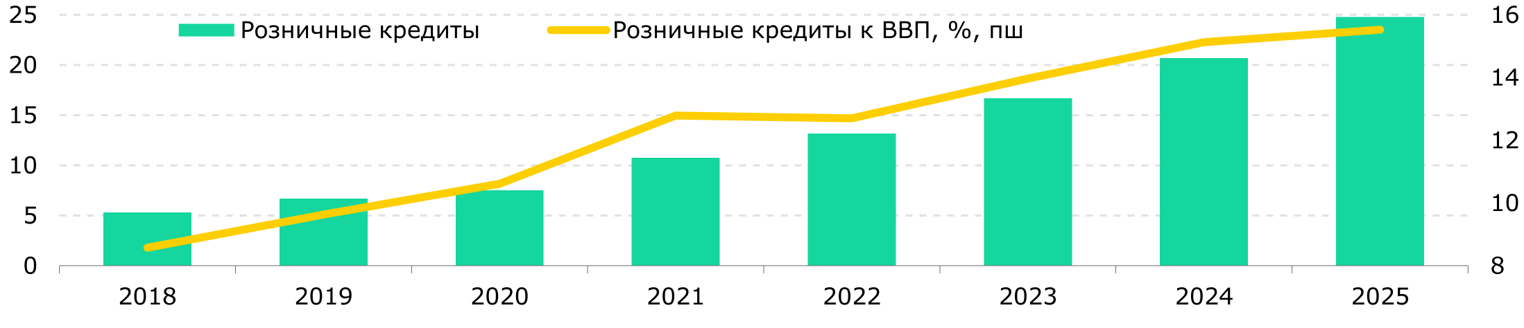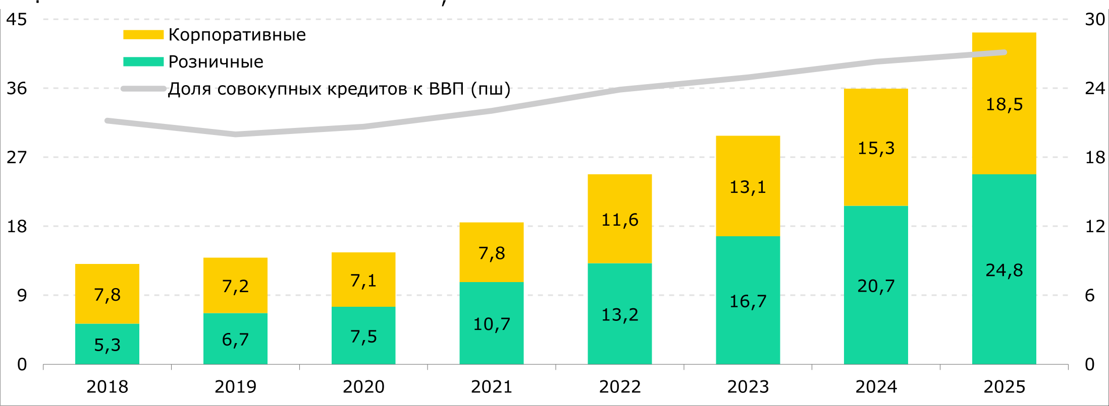 Структура экономического роста характеризуется выраженной асимметрией в пользу сырьевого сектора. Данный фактор обусловил отсутствие соразмерной динамики роста активов банковского сектора. Кроме того, на замедление темпов прироста активов повлияли более низкие по сравнению с предыдущими периодами темпы прироста кредитного портфеля коммерческих банков: рост на 20,4% в 2025 году, в том числе по розничному кредитованию - на 19,8% г/г, корпоративному - на 21,2% г/г. Основными факторами роста объемов кредитования являются потребкредиты, льготные кредиты и ипотека.
