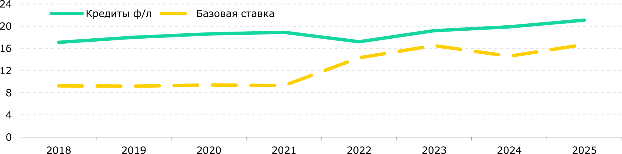 На наш взгляд, низкий уровень кредитования бизнеса связан главным образом с высокой базовой ставкой на фоне устойчивого инфляционного давления, а также с конкуренцией со стороны государственных льготных программ, которые искажают рыночные принципы и ценовые сигналы. В свою очередь, устойчивый инфляционный фон является следствием процикличной бюджетной политики, которая, по нашим оценкам, будет продолжена в 2026 году.