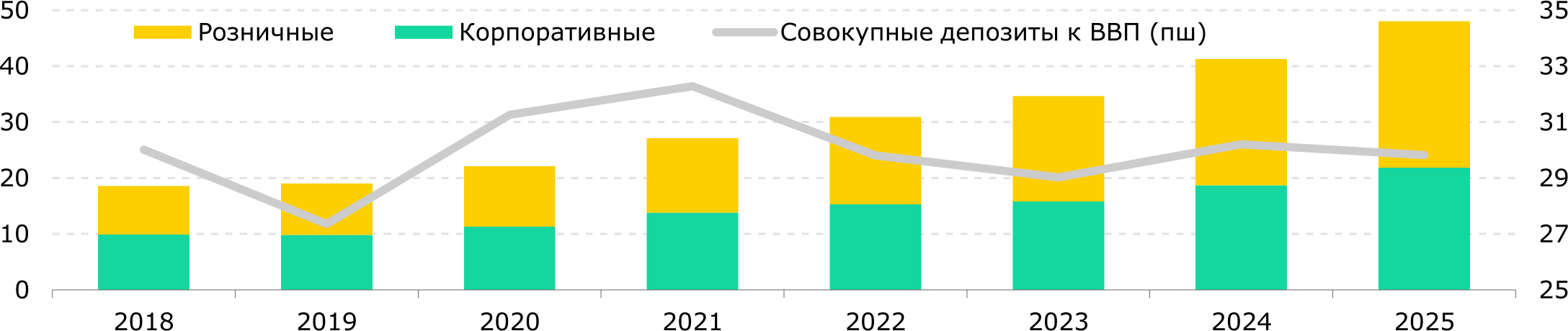 Розничные депозиты значительно нарастили темп роста с 2019 года, увеличив долю к ВВП с 13,2% до 16,4% в 2025 году (Рис. 16). Такая динамика во многом связана с опережающим ростом депозитного розничного портфеля.