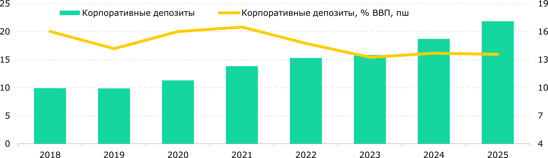 Рис. 14. Корпоративные депозиты, Т трлн и доля к ВВП, % (2018 – 2025 годы)