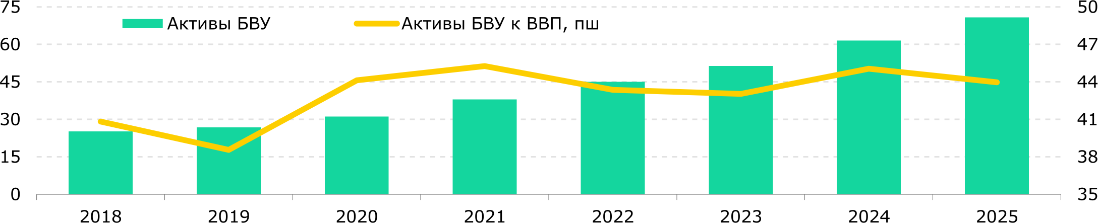 Рис. 1. Активы БВУ, Т трлн и их доля к ВВП, % (2018-2025 годы)