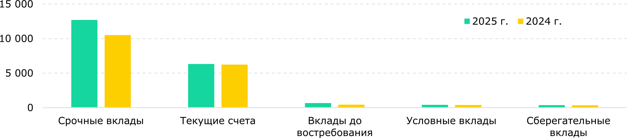Рис. 15. Структура корпоративных депозитов за 2024 и 2025 годы, Т млрд