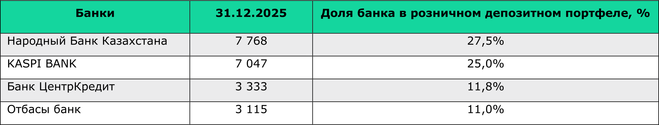 Таблица 6. Банки-лидеры по розничным депозитам на 31.12.2025, Т млрд