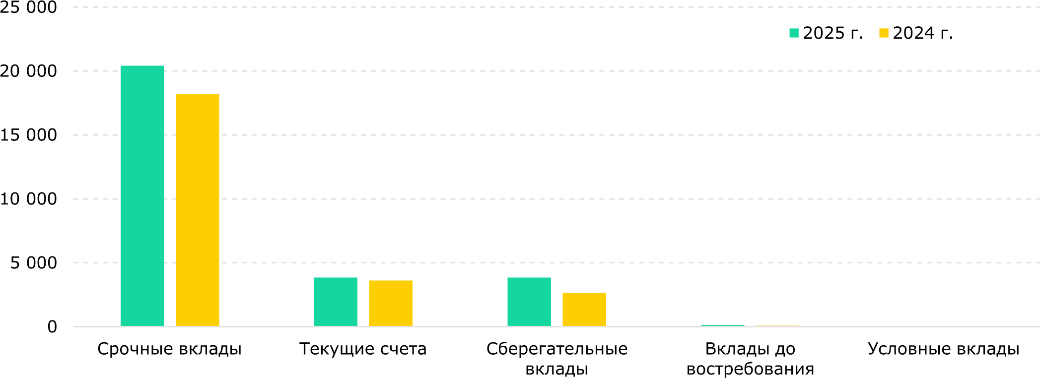 Основную долю вкладов юрлиц за 12 месяцев 2025 года составляют срочные вклады (62%) и текущие счета компаний (31%) (Рис. 15). Другие вклады (условные, сберегательные и до востребования) занимают незначительную долю и не влияют на динамику депозитов компаний.
