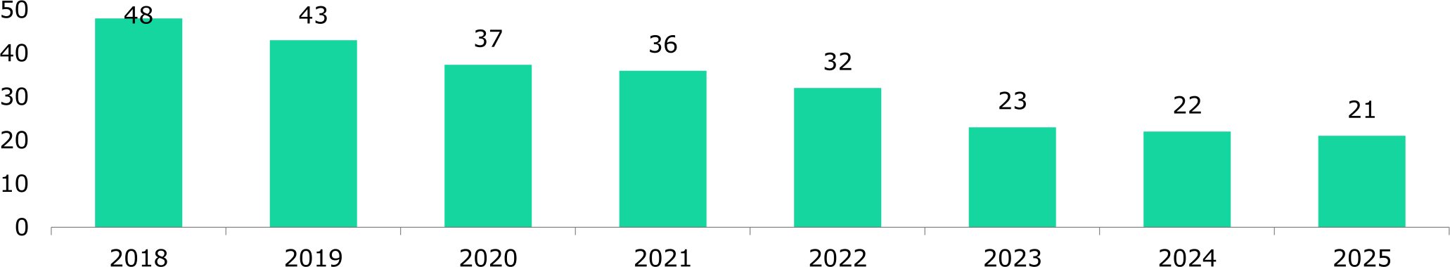 Рентабельность использования активов (ROA) значительно повысилась – с 3,7% на конец 2022 года до 4,6% в конце декабря 2023 года, после чего вновь начала снижаться до 4,2% к концу 2025 года (Рис. 19). Такая же динамика наблюдается по рентабельности капитала (ROE) – за 2023 год она выросла с 30,6% до 36,1%, после чего снизилась до 28,4% к концу рассматриваемого периода.
