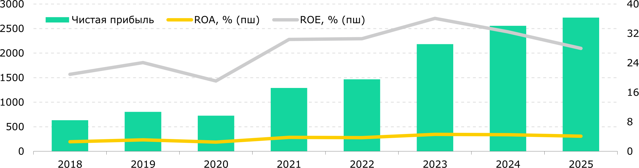 Прибыль банковского сектора за 12 месяцев 2025 года сложилась на уровне Т2 724 млрд. В условиях жесткой денежно-кредитной политики, обусловленной инфляционным давлением и фискальным стимулированием, положительная динамика прибыли была обеспечена преимущественно за счет процентных доходов (+20,6% г/г), которые явились основным фактором роста прибыли. Дополнительное положительное влияние оказали выросшие доходы от восстановления резервов (+29,7% г/г), тогда как чистые комиссионные доходы (-15,6% г/г) сдерживали данный рост.