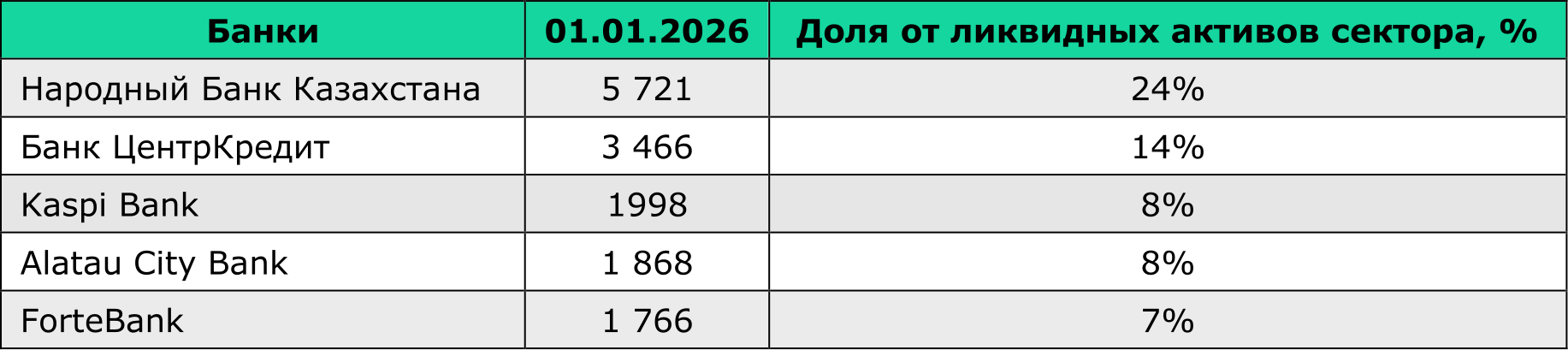 Таблица 2. Топ 5 банков по ликвидным активам, Т млрд