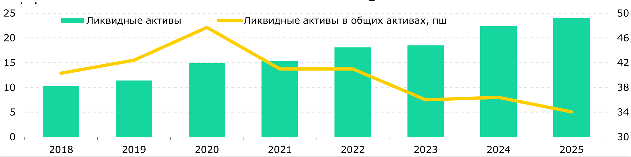 Рис. 3. Ликвидные активы банковского сектора, Т трлн, % (2018–2025 годы)
