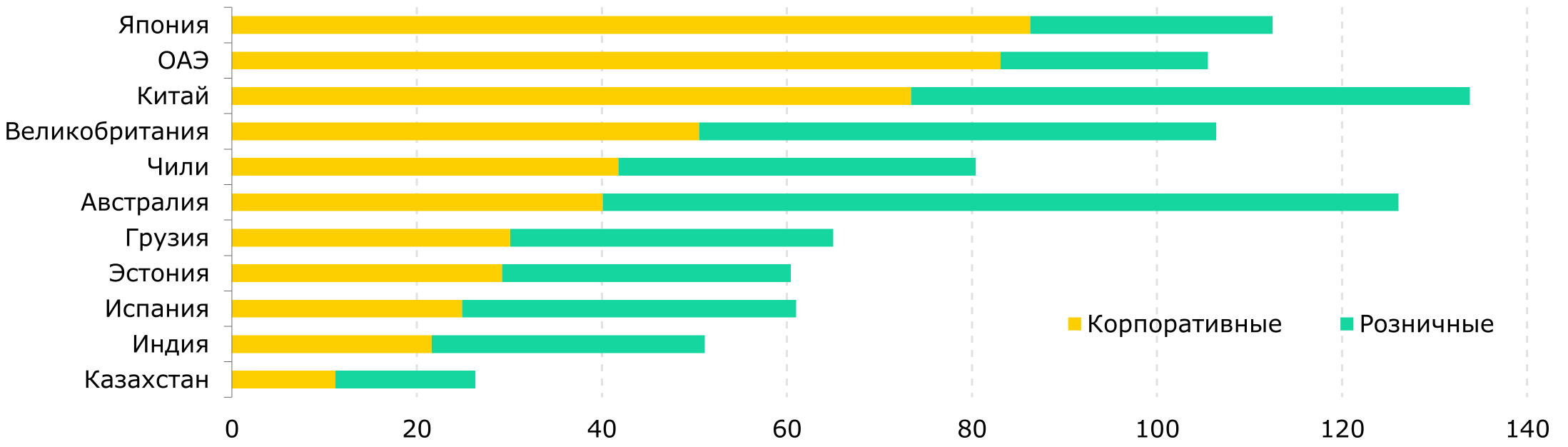Рис. 6. Корпоративный и розничный сектор кредитования банков в различных странах, 2024 год, % к ВВП