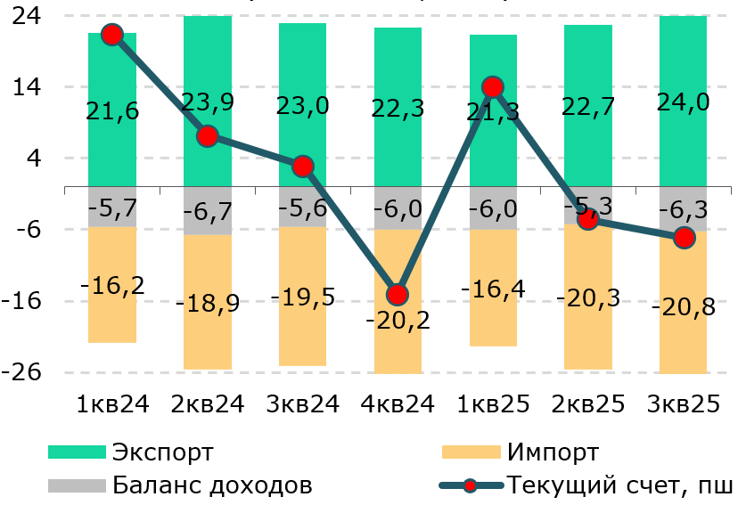 По итогам третьего квартала 2025 года дефицит текущего счета увеличился до $3,1 млрд, превысив показатели второго квартала и аналогичного периода прошлого года. Основным фактором расширения дефицита стало сокращение внешнеторгового профицита и углубление отрицательного сальдо первичных доходов. Внешнеторговый профицит продемонстрировал значительное снижение с начала 2025 года на фоне роста импорта и слабого роста экспорта. Сохраняется дефицит услуг, продолжая оказывать давление на текущий счет. По финансовому счету зафиксирован чистый приток капитала, чему способствовали притоки по портфельным и прочим инвестициям, компенсировавшие отток по прямым инвестициям.